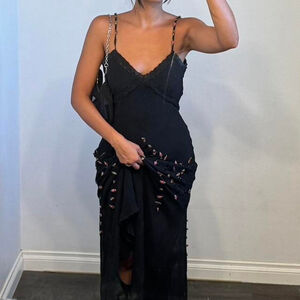 Vintage black silk maxi embroidery dress! The cutest little vintage silk Black lace maxi dress with pink floral details!