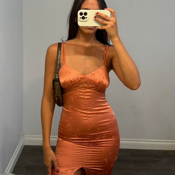 Orange silk midi dress with a slit on the side by sage the label!