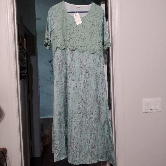 size large brand new never been worn, Green, with some black and white designs quarter length polyester blend with lace top on front and lace on the sleeves with pockets. Can wear with or without belt.