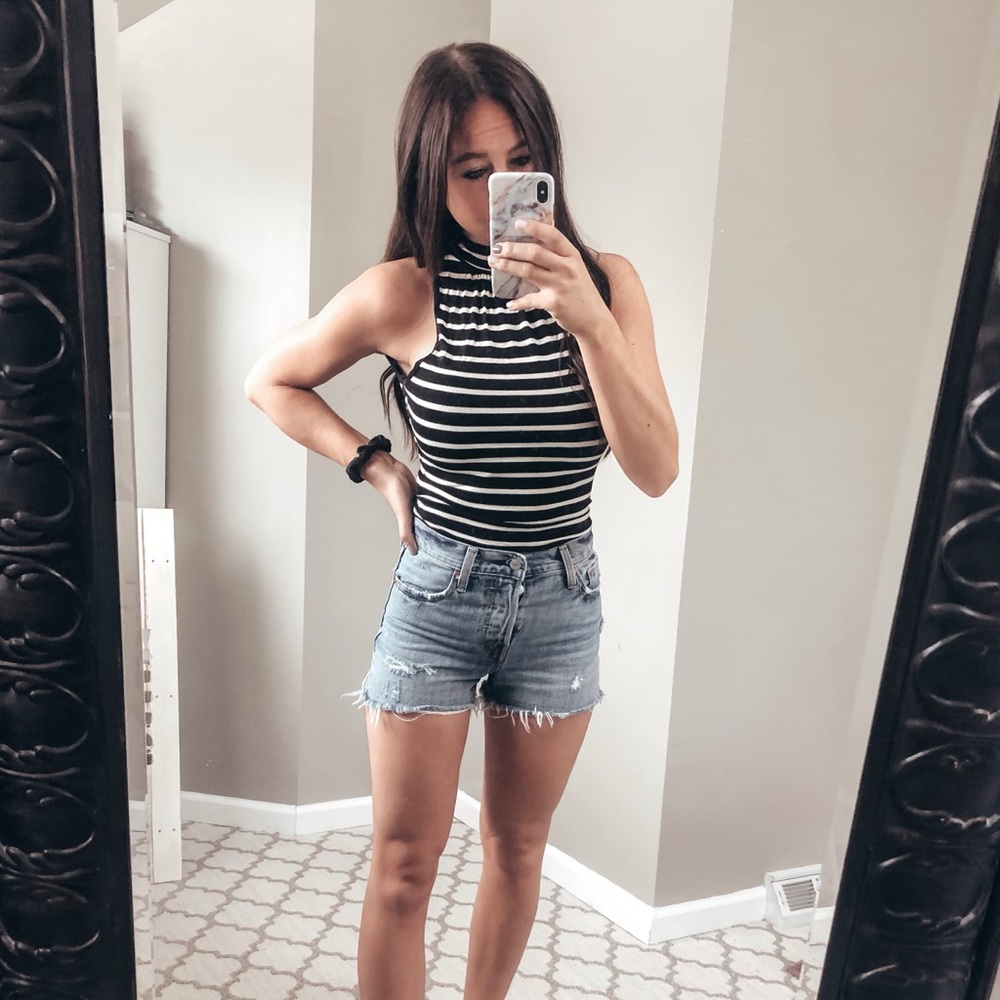 Stripped bodycon dress. It’s a little short on me, being 5’2, so i styled it as a shirt as well! completely open back.