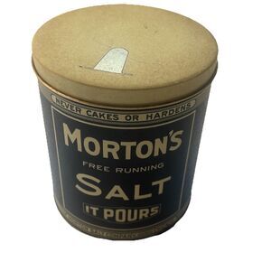 A classic piece of kitchen advertising nostalgia. This is a decorative reproduction tin, not an original antique salt can.