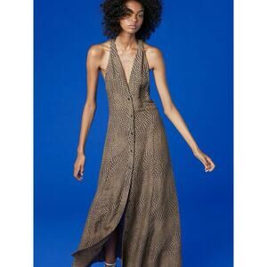 The Diane von Furstenberg Sleeveless Button Down V Neck Brown Print Dress in size S is a stylish and elegant long maxi dress designed for women. The sleeveless design and v-neckline give it a modern and chic look, perfect for various occasions. The brown print adds a pop of color to the dress, making it versatile for pairing with different shoes and accessories. Made from a luxurious down fabric, this dress offers both comfort and sophistication, embodying the iconic style of Diane von Furstenberg.