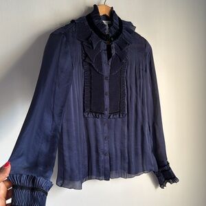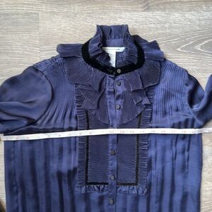 -High collar, a velvet trim, button-fastening cuffs, long sleeves, pleating at shoulders and button-fastenings through front.