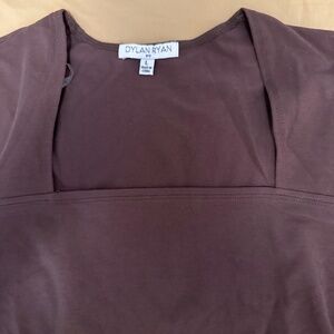 The product is a brand new long sleeve shirt for women by Dylan Ryan in size large. It features a square neckline and is made of 100% cotton in a stylish brown color. This blouse offers a comfortable and fashionable option for women looking for a versatile addition to their wardrobe.