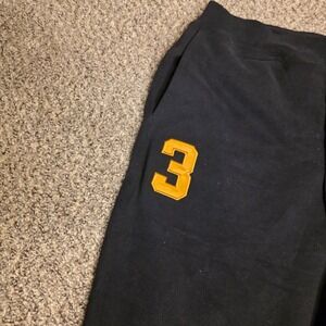 Polo Ralph Lauren fleece sweatpants in a solid black finish showcase the iconic Triple Pony embroidery in vibrant gold on the left thigh. These joggers are detailed with a large yellow "3" patch on the right leg, paying homage to traditional polo team uniforms. Designed for comfort, they feature an elasticized drawstring waistband, ribbed cuffs, and side seam pockets, along with a single rear patch pocket. The heavy-duty cotton blend fabric provides a soft, warm feel ideal for athletic wear or casual lounging.