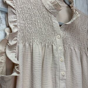 Chic beige blouse with ruffle sleeves. Features a buttoned front and textured fabric. Ideal for stylish comfort.