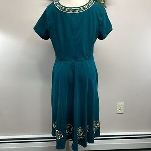 eShakti Custom Embroidered Short Sleeve Fit and Flare Dress. Good preowned condition. Dress is a custom size equivalent to a M-L, please see measurements in photos. Embroidery around neckline and hem, heavy knit fabric, back zipper with hook and eye closure, two side pockets. Please see photos for details. Item may show difference in color based upon photography and perception. Photos are part of the description, as everyone’s level of condition may vary. From smoke free and pet free home. All packages are shipped the same or next business day.