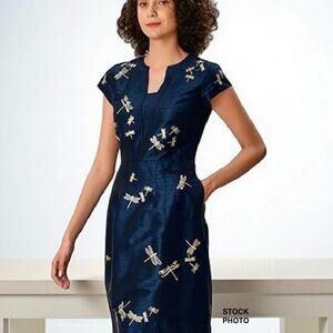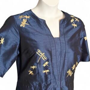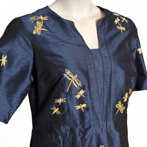 eShakti Dragonfly Embroidered Midi Dress 1X Blue Gold Silk Look Pleated Pockets