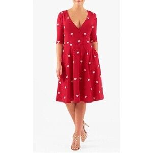 The eShakti Embellished Heart Cotton Knit Over the Knee Dress in red is a stylish and flattering choice for a party or cocktail occasion. With a V-neckline, 3/4 sleeves, and a fit and flare style, this dress is both comfortable and chic. The heart embellishments add a touch of whimsy, perfect for Valentine's Day or a retro-inspired look. The inclusion of pockets adds both functionality and detail to this knee-length dress, making it a versatile option for fall and spring seasons.