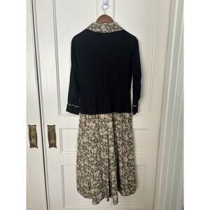 A cute midi length slight fit and flare dress in black top and a floral skirt in green, tan, and yellow.