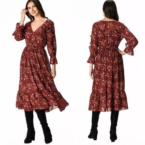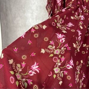 eShakti Floral Print Ruffle Georgette Dress In Maroon Women's Size XL-16