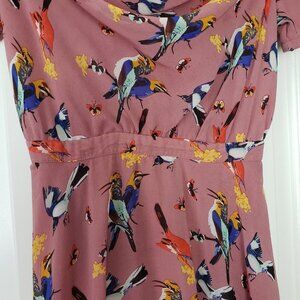 eShakti Flowy Bird Print Dress Pink Womens Small Lined Cowl Neck Midi