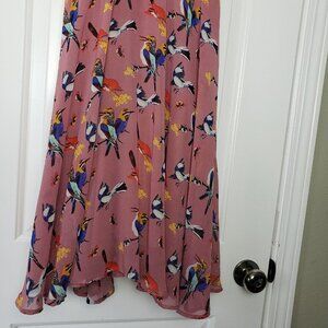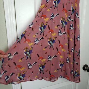 eShakti Flowy Bird Print Dress Pink Womens Small Lined Cowl Neck Midi Chiffon