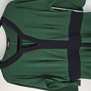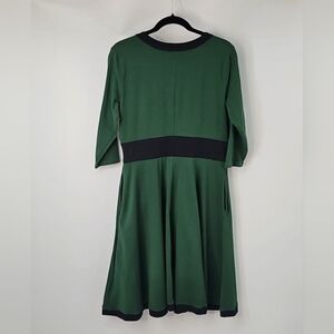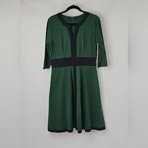 eshakti Dark Forest Green with Flattering Black Trim Accent Fit and Flare Dress Retro Inspired 40s-50s Vibe Throwback Memories. Side Zipper. Magnetic Clasp Buttons from Waistline Down. One Button Missing. Replacement Attached Inside near Care Tag (see pics). Simply Beautiful Dress!