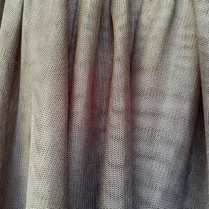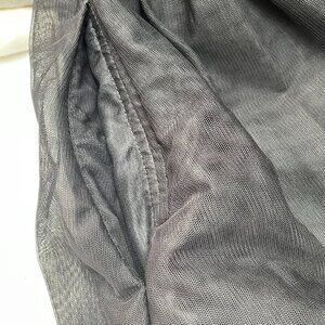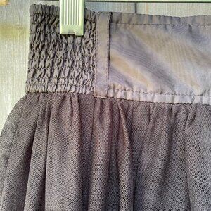 This triple-layer formal skirt is made of a black satin-like lining overlaid with two layers of a soft, drapey sheer black fabric. This comfy skirt features a zipper back and elastic panel at the waist for stretch, and belt loops. It's flowy with a good weight to it- great for prom, the opera or theater, a black tie event, or a wedding guest.