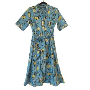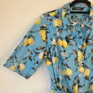 eShakti Lemon Printed Shirt Dress 1X Blue Midi Belted Retro Pinup Rockabilly
