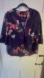 eShakti popover V-neck floral blouse. Navy blue with clusters of flowers in pink, coral, white, and green leaves. Lightweight fabric (not sheer) with a relaxed, loose silhouette. 3/4 length sleeves with a flounce/ruffle detail at the end. In excellent pre-loved condition.