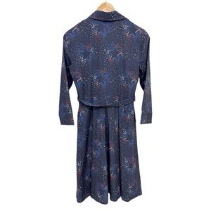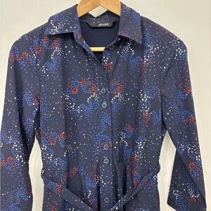 eShakti Red White Blue Star Pattern Navy Long Sleeve Belted Shirt Dress July 4th