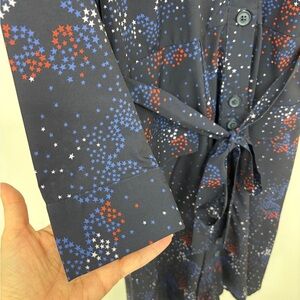 Tags: 4th fourth of July dress, red white and blue dress, dress with stars, star pattern, patriotic dress, coastal cowgirl, festival, country music, Nashville dress, navy blue shirt dress, long sleeve button up dress,