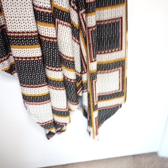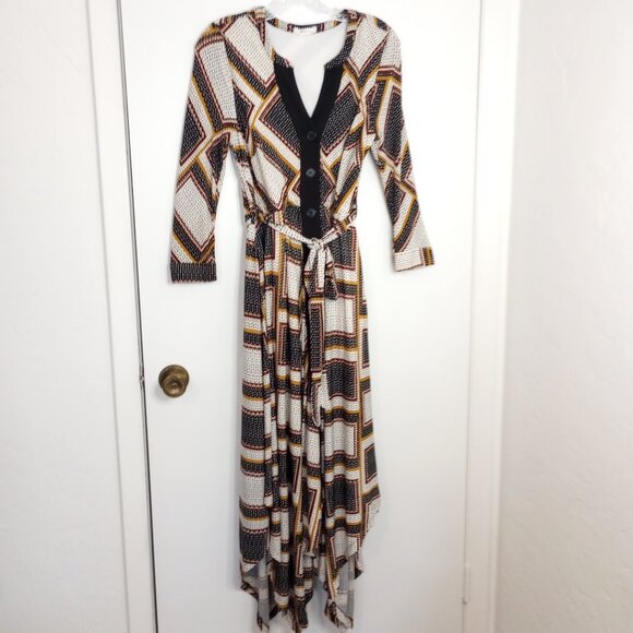eShakti Striped Button Front Handkerchief Hem Shirtdress, 3/4 sleeves, elastic waistband, removeable waist belt, lined, side pockets. Long midi to maxi length, asymmetric hemline. Stripes & patterns is pretty fall colors. Preppy with a modern twist. Great dress for work, going out, casual occasions. Size 0. Pre-owned in very good condition. Non-smoking home, pet friendly. Measures (flat) approx. 16" across the armpits, 13" armpit to end of sleeve, 13.5" across the elastic waistband. Shoulder to hemline ranges 40 to 54". *The model image for this item was AI-generated for illustrative purposes and may show slight variations from the actual product. Please refer to photos of the actual item for accurate details.