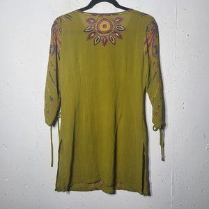 eShakti Womens Green Sheer Abstract Quarter Sleeve Blouse Size XS Boho Lagenlook