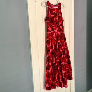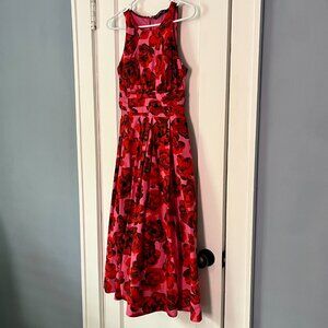 eShakti pink red floral midi dress size small / 6 smocked full skirt