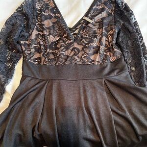 Black with lace overlay low V cut front and back. Has shorts underneath