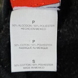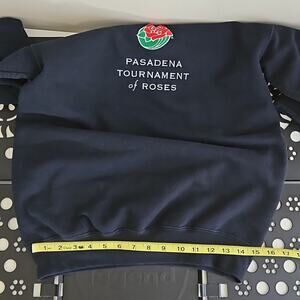 Circa 2005, this near vintage, officially licensed Rose Bowl pullover sweatshirt. Embroidered Pasadena Tournament of Roses decorates the front. Made from a polyester and cotton blend fabric in black with a fleecy interior. Crew neck. Cuffed hem and wrists.