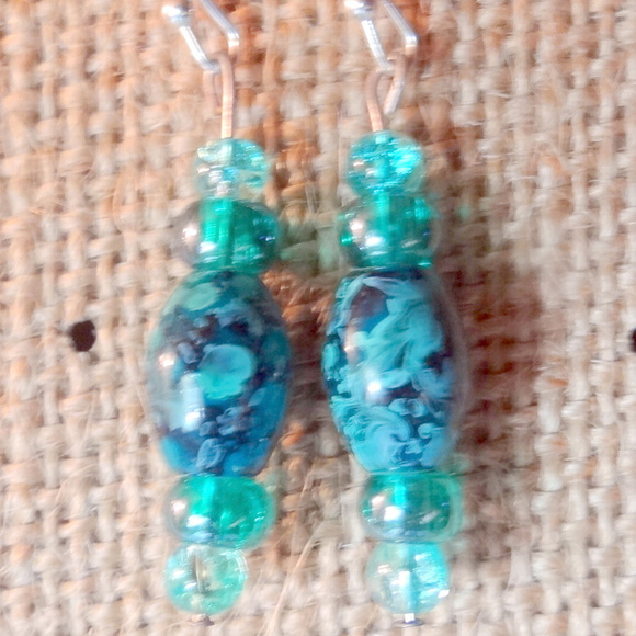 blue green beads, seed beads, silver tone findings.