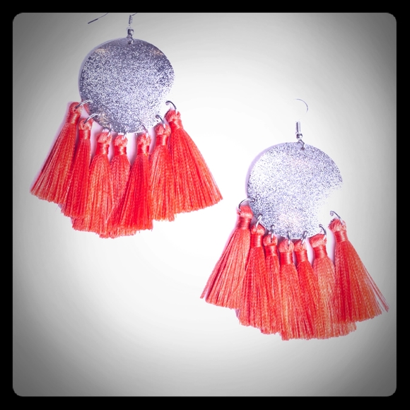 bright orange tassel earrings.