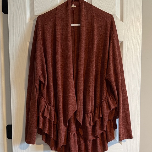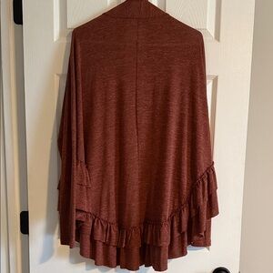 Lightweight open-front cardigan with layered ruffle hem. Soft knit fabric for easy layering. Draped silhouette creates a relaxed, feminine look. Neutral rust tone pairs well with many outfits.