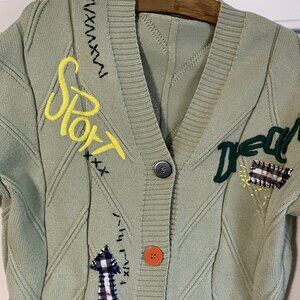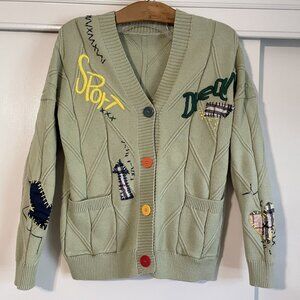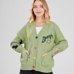ebossy Women's Green Chunky Cable Knit Sport Dream Embroidery Cardigan Sweater Size M