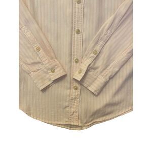 Eddie Bauer light pink and white stripped button down. Really breathable material. It has a front left pocket. It has cream buttons.