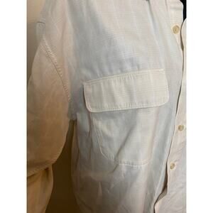 off white cream color with subtle plaid. 2 large front pockets and buttons on the cuffs. collared and in good used condition. pretty sure this is vintage from the early 2000s. size large
