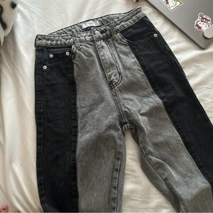 stylish two-tone jeans featuring a sleek black and gray design. perfect for a modern, edgy look.