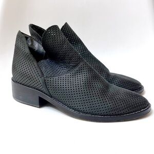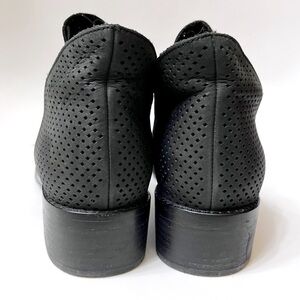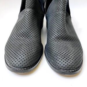 Elegantly shaped with a tulip topline, the Leaf ankle boots from Eileen Fisher maximize your wardrobe rotation with a minimalist perforated suede design. I believe the color is black, although it does appear to be more of a dark charcoal gray in some light. There is some wear to these, please note the flaws to the leather in photo 8. Still plenty of wear left in these!