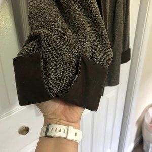 Darker brown detail at end of three-quarter length sleeves and at button down. Buckle at neck. Leopard Broach can be removed.