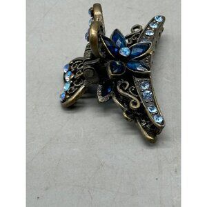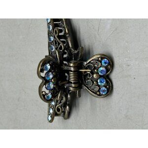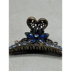 Elegant floral metal hair clip featuring a blue heart and butterfly design. Embellished with blue faux stones, this clip adds a touch of sophistication to any hairstyle.