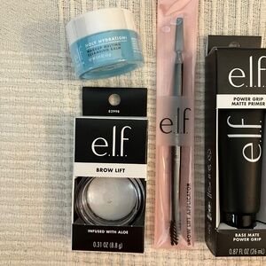 Bundle of 5 brand new elf make up essentials. Lot includes brow lift plus double sided brow lift applicator brush, power grip matte primer, power grip 4% niacin amide primer and holy hydration makeup melting cleansing balm. Some of these are travel sized items so please review photos for exact fl oz. What you see is what you get! Estimated retail value is $30! You will receive the exact items pictured, it will be carefully packaged for safe shipment to you. Please review all photos as they are included as part of the description. Smoke free home, feel free to ask any questions!
