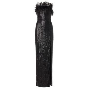 This Elle Zeitoune gown features a strapless design with a feathered neckline and sequin embellishments, creating a glamorous and sophisticated look. Pair it with minimal jewelry and strappy heels to let the dress shine at an elegant evening event.