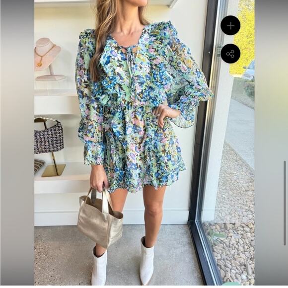 elliatt milani green & blue floral ruffle long sleeve mini summer dress small