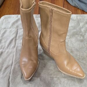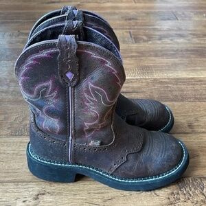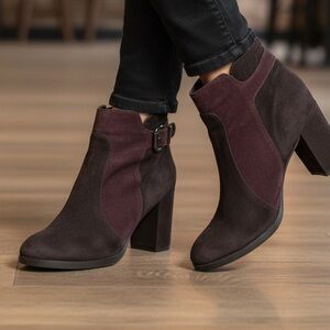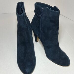 Black suede boots with embroidered red rose pattern on outward facing side. gold zipper.