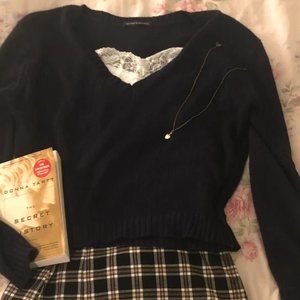 -brandy navy blue sweater, white lace tank, and black plaid skirt