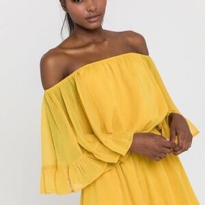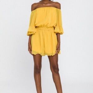 These off-the-shoulder ruffle trimmed romper is easy to dress up or down for effortless style. Fit: this style fits true to size. - Off-the-shoulder - 3/4 length bell sleeves - Elasticized waist - Ruffle trim - Lined - Approx. 29" full length, 2" inseam (size S) - Imported. 100% polyester. Size XS