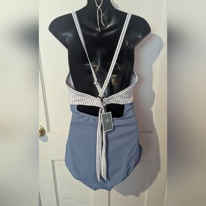 Stylish swimsuit with a striped top and blue bottom. Features a trendy cutout design.