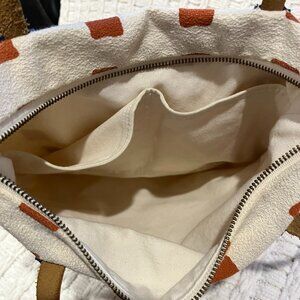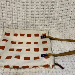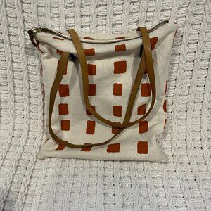 In great condition erin flett canvas purse with real leather straps. Orange rectangle pattern with navy blue accents. I only used the purse a few times and really like it but just didn't reach for it that much compared to my other bags.