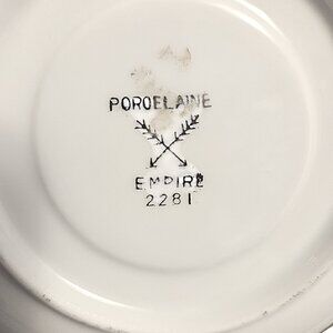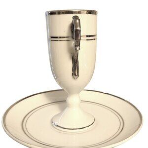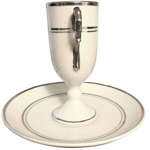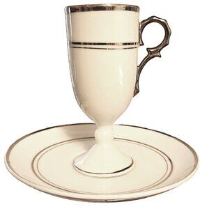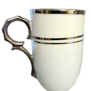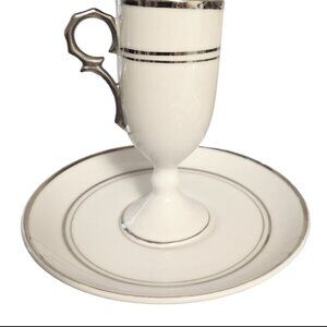A Porcelain Espresso/Demitasse Cup and Saucer Set by Empire is listed for sale. This Vintage Porcelain Cup and Saucer Set is White with Silver Trim and is in excellent condition, free of chips, scratches and crazing.