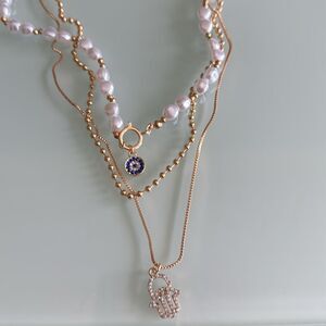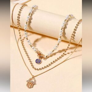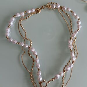This stunning layered necklace set features elegant gold chains adorned with lustrous pearls. Perfect for adding a touch of sophistication to any outfit.