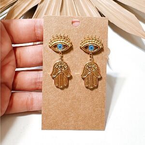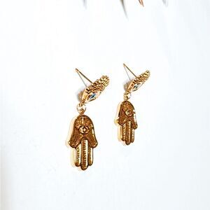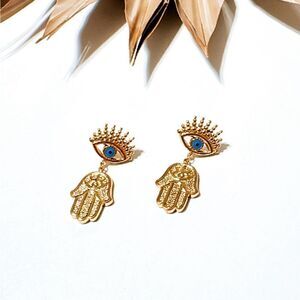 Evil eye hamsa dangle stud earrings in 18k gold plated hardware