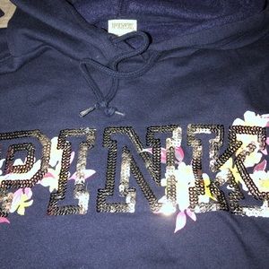 Hoddie from pink sequins are silver and is in excellent condition color blue with flowers and front pocket still fuzzy inside size L this is not oversized